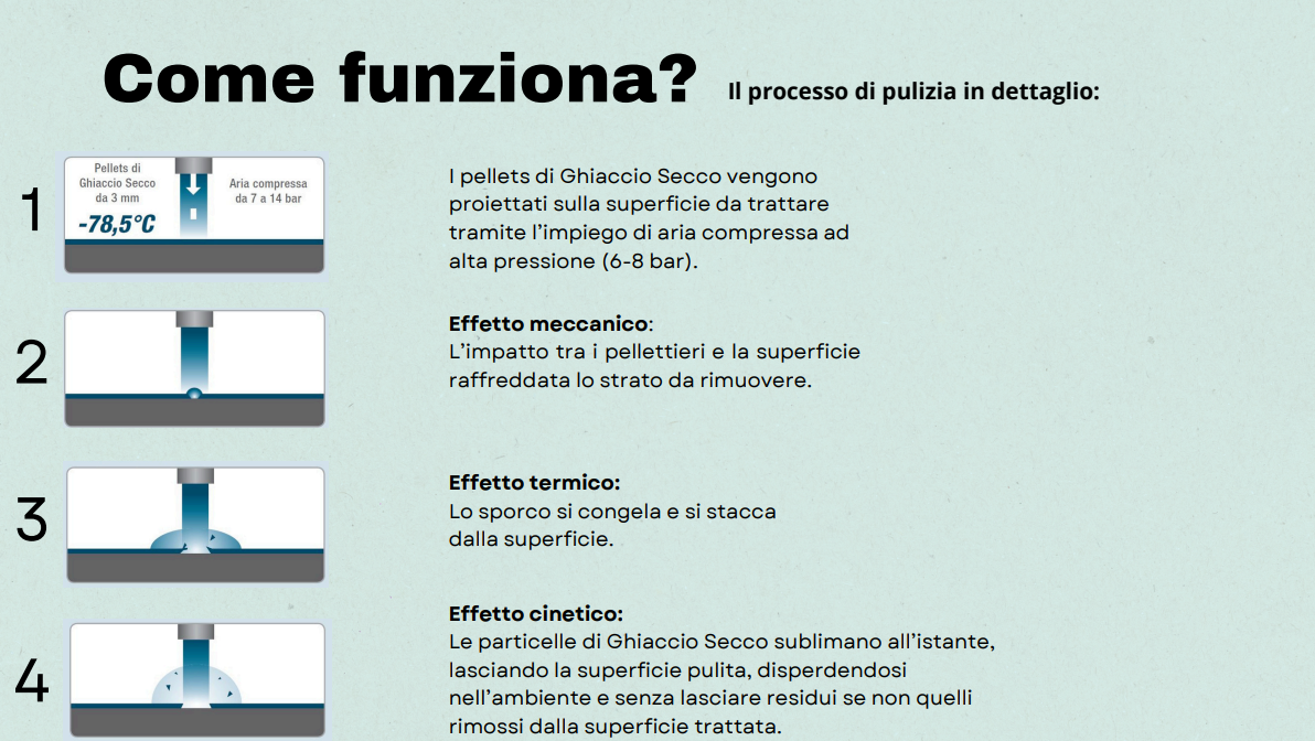 ghiaccio secco (CO₂ allo stato solido) proiettato ad alta velocità sulle superfici da trattare. L’azione combinata dell’impatto meccanico, dello shock termico e della sublimazione consente di rimuovere sporco, residui e incrostazioni senza abrasione.