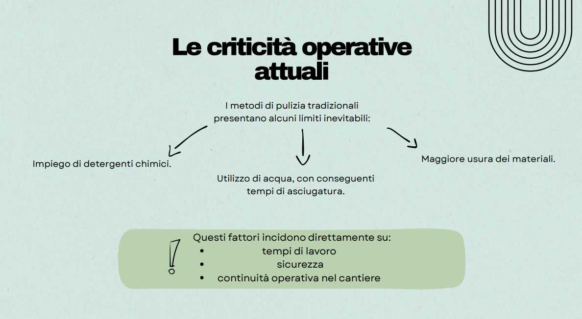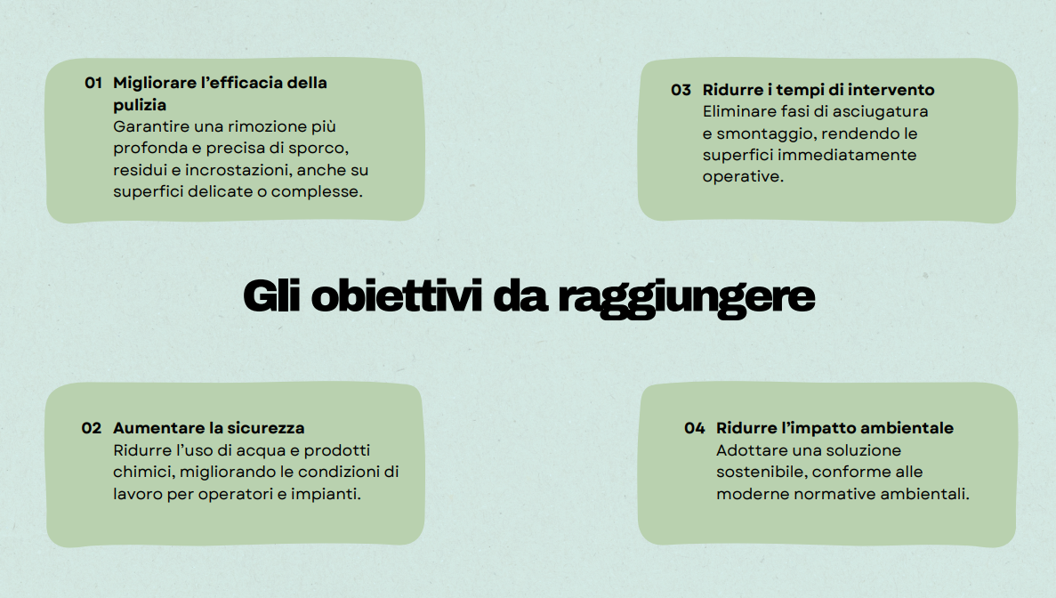 Si tratta di un metodo che consente di intervenire su superfici e impianti senza l’uso di acqua o detergenti chimici, riducendo l’impatto ambientale e i tempi di fermo, aspetti oggi centrali per molte realtà operative del territorio.